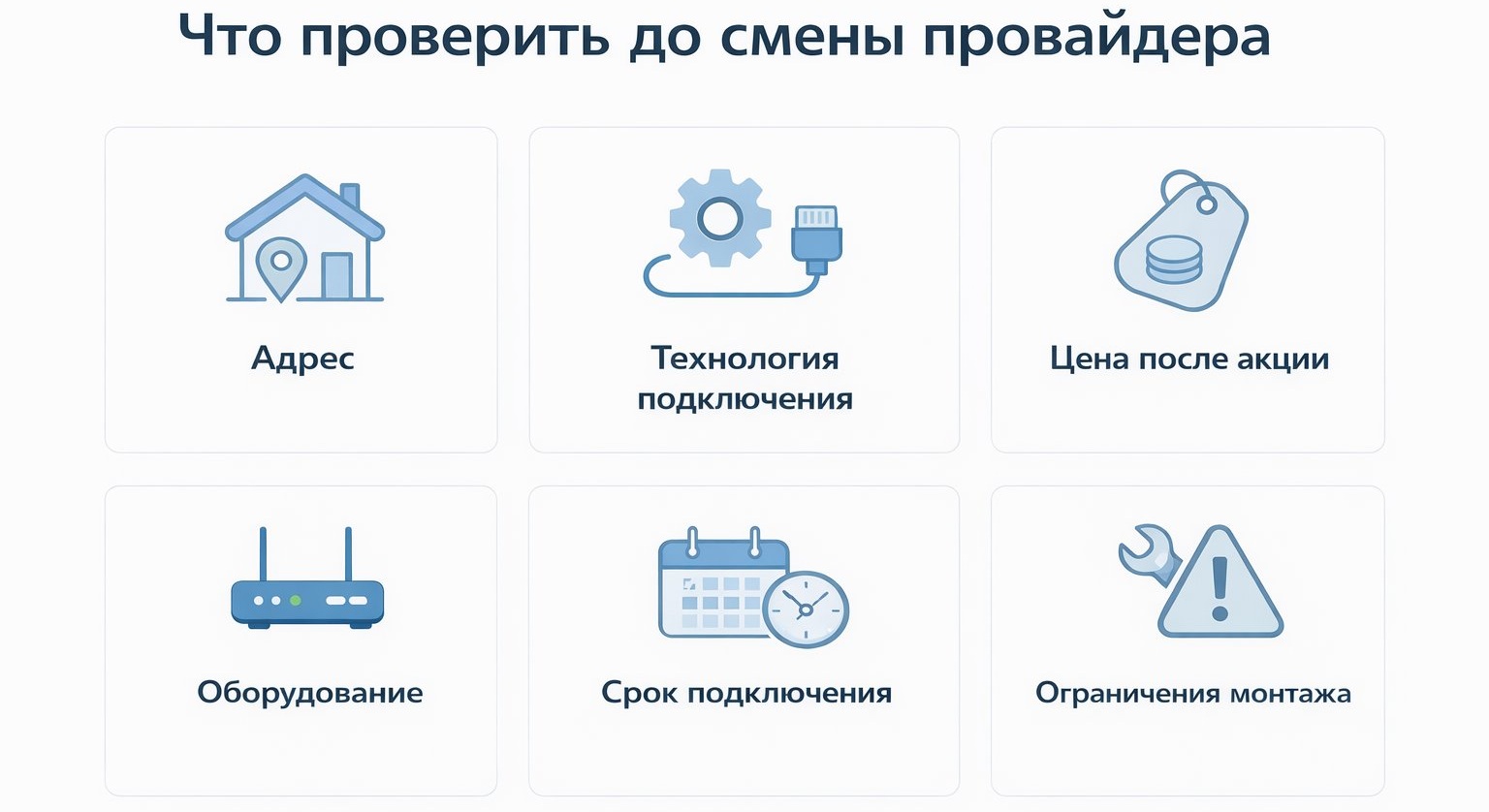 Перед сменой провайдера сначала проверяют адрес, технологию, цену, оборудование и срок подключения
